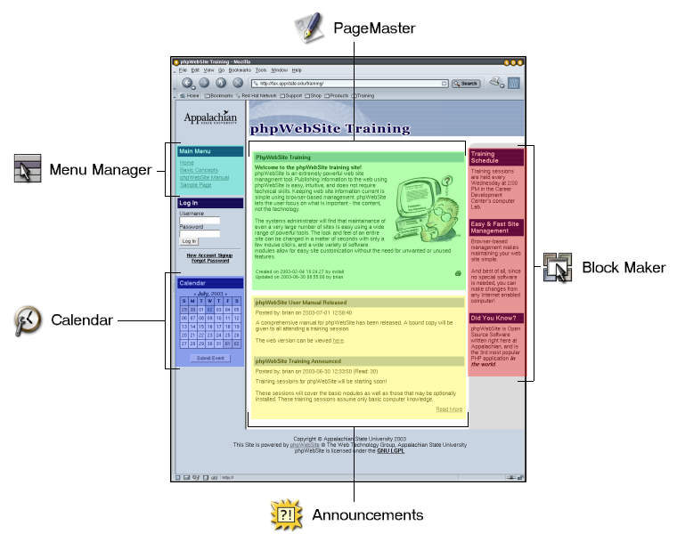 Instead we have a collection of icons and links. These represent the various modules that allow you to provide and manage content for your site. Unlike single-page generation tools, phpWebSite serves as a framework that dynamically organizes your content. Each page you view on your site is the work of many modules providing information that the phpWebSite engine puts together into the web page viewed by the site visitor. Let's look at that original web page again, this time showing the modules that are working together to build the page: