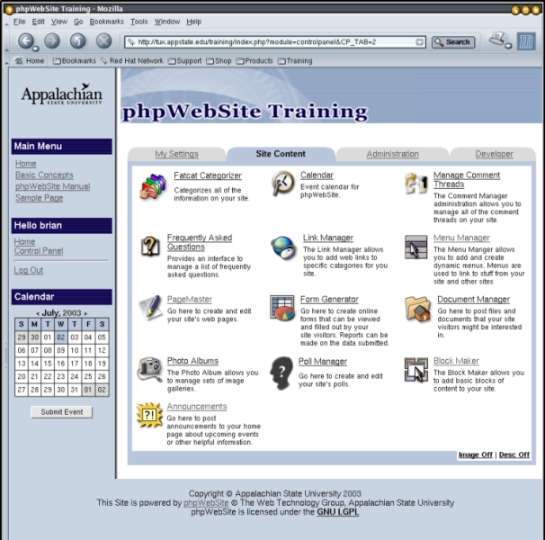 What we see now is that phpWebSite has gathered up and presented the information on the site based on the module used to provide it. Different modules handle different types of information. One of the keys to using phpWebSite successfully is using the right module for the right information. In the pages that follow, each module is covered in detail. The important thing to note at this point is that we manage our site by managing our content. This is why phpWebSite is frequently referred to as a "Content Management System".